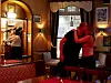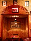 Her inne er det båser med benker med brune skinnseter. Mahognibord med løpere, stumtjenere, trepaneler og middelaldermotiver på veggene. Det er som om interiøret og klientellet klorer seg fast i fortiden.