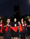 En gruppe kvinner som bærer et langt rødt bånd mellom seg kommer marsjerende inn til markeringen. Båndet er et symbol på Los desaparecidos, de som forsvant og ble arrestert under det 17 år lange diktaturet i Chile fra 1973 til 1990. Demonstrantene mener staten er medskyldig i Chuñils forsvinning i 2024.