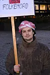 Vegard Møkleby, som vanligvis jobber som seniorkonsulent på Institutt for informatikk står på Fredrikkeplassen med et skilt hvor det står «Velferdstat uten folkemord».