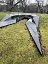 Hun trår på kanten av installasjonen og oppdager at den har løsnet fra bakken under. Samtidig kommer det en hul lyd fra materialet. Ved første øyekast ser benken ut som tung stein, men den er laget av glassfiber.